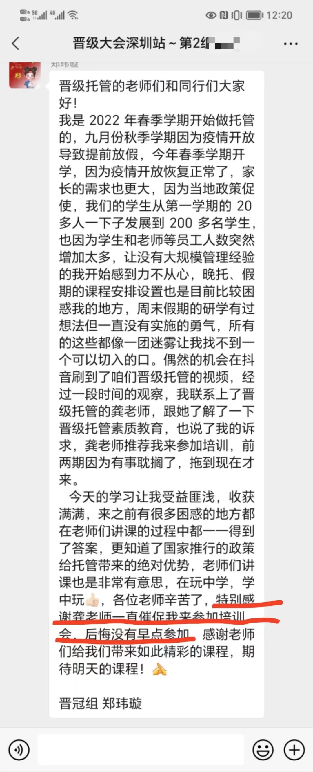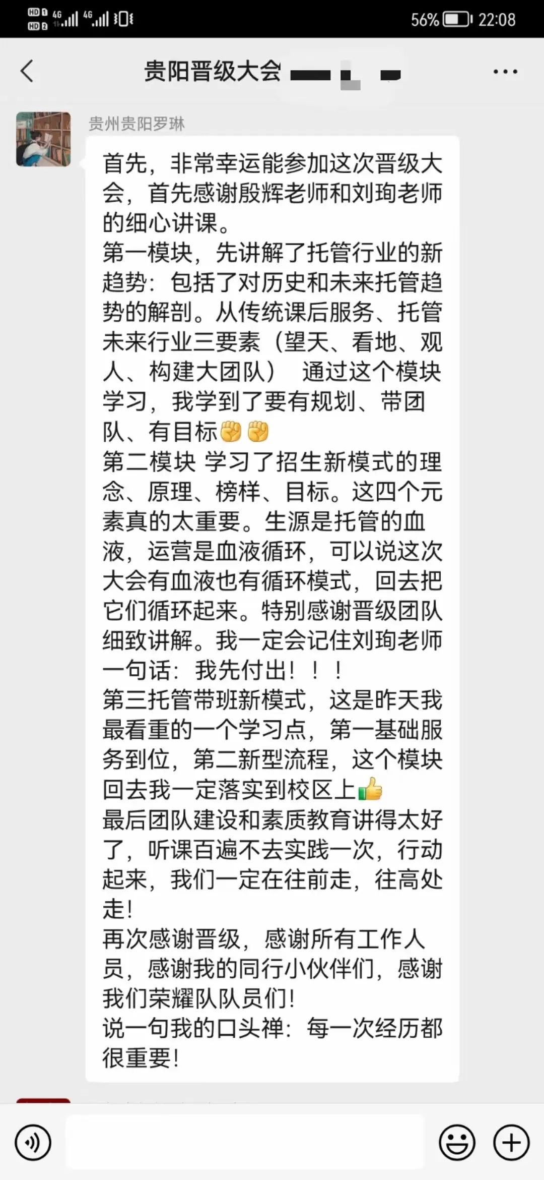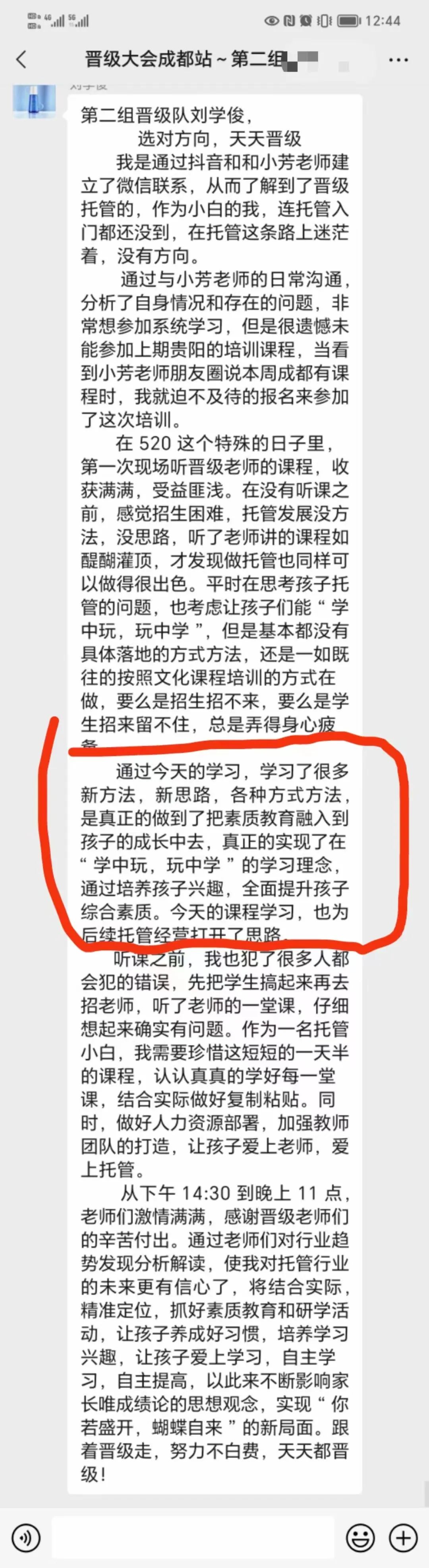 从教培行业转型到托管行业的校长分享到:因为与晋级结缘,多次学习之中他明白了做托管行业不正做托管的钱,而是挣其他的钱,在研学旅行的项目讲解之中他收益颇丰。