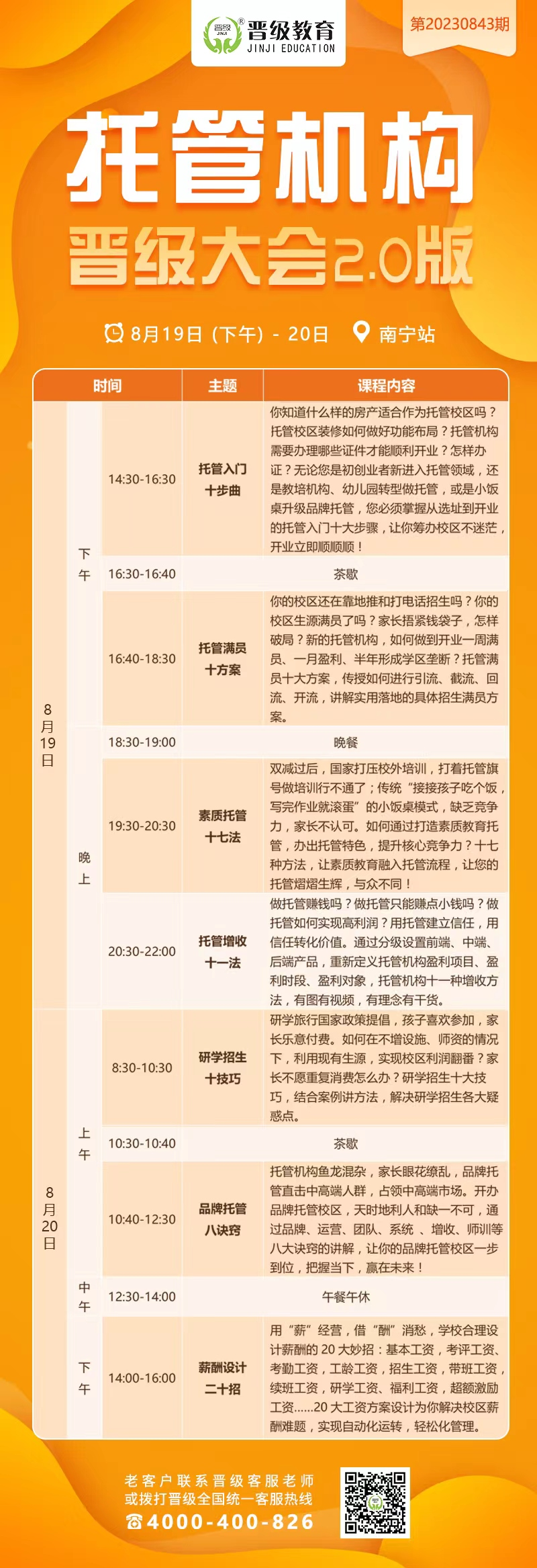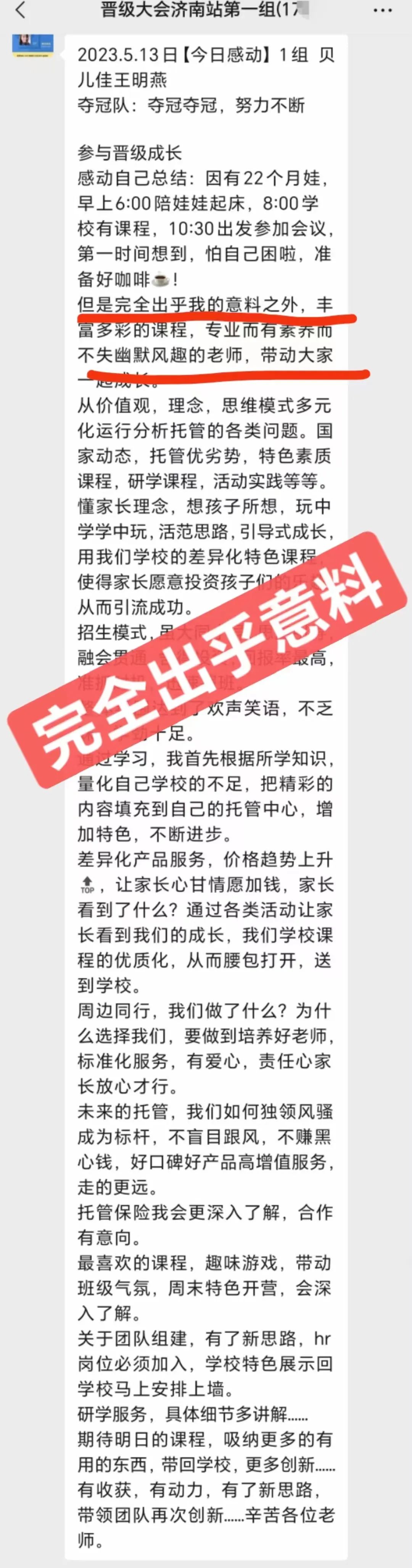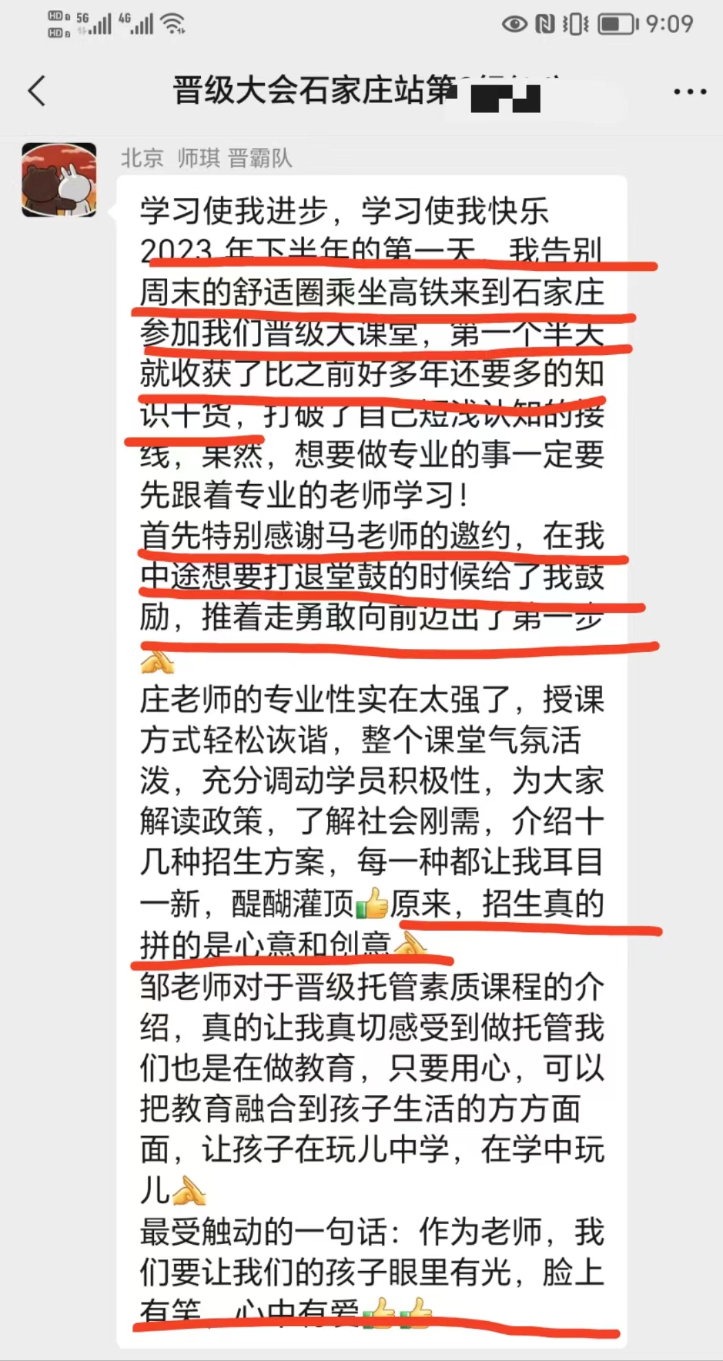从教培行业转型到托管行业的校长分享到:因为与晋级结缘,多次学习之中他明白了做托管行业不正做托管的钱,而是挣其他的钱,在研学旅行的项目讲解之中他收益颇丰。