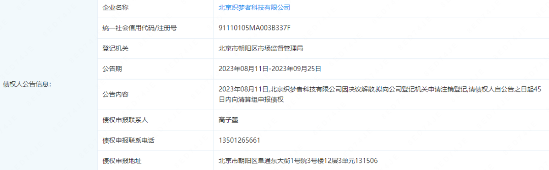 企查查显示,北京织梦者科技有限公司在8月11日因决议解散而申请了注销登记。