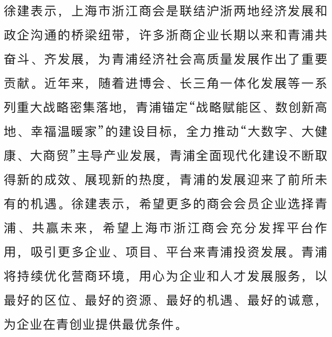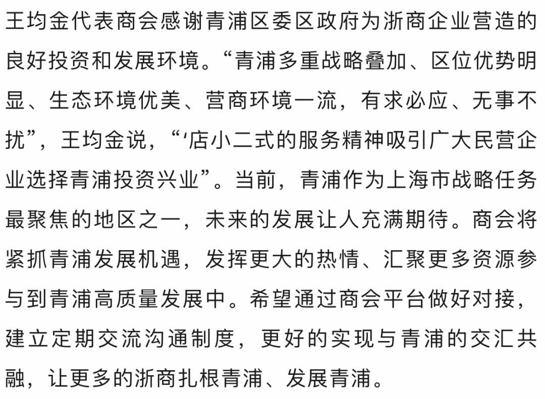 青浦区工商联主席、商会执行副会长池学聪在欢迎辞中表示,青浦未来正规划打造“两翼齐飞、新城发力、青东联动、青西协同”的空间新格局,未来可期,相信浙商将在这片热土上再现精彩。