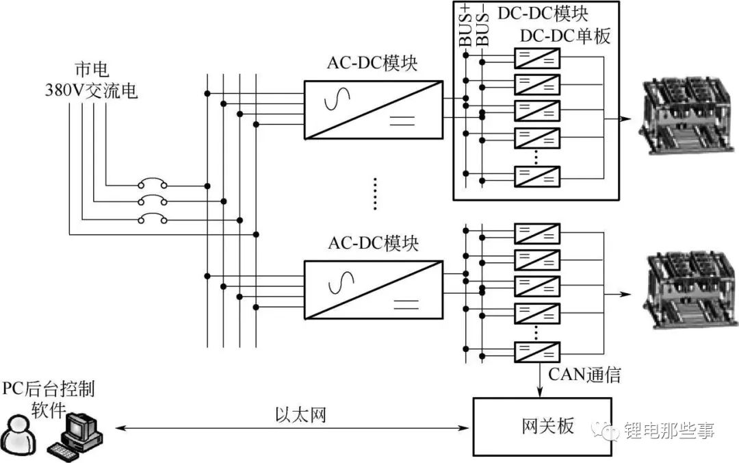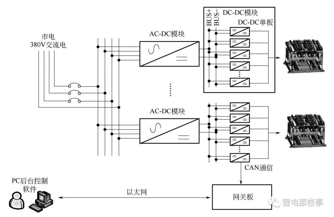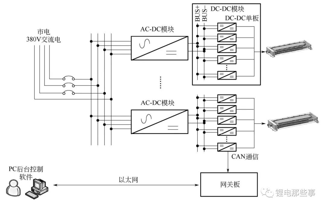 充电电源单元由交流-直流(AC-DC)模块、直流-直流(DC-DC)模块和监控用网关板组成。AC-DC模块将交流电变换为14V直流电,并为多个DC-DC通道提供能量。DC-DC通道采样开关电源技术将14V直流电变换为5V直流电,为电芯提供充电能量。为便于维护,DC-DC部分采用模块化设计,每8个DC-DC通道组成一个DC-DC模块。每个DC-DC通道与网关板之间采用控制器局域网络(CAN)总线进行通信,实现后台对各个通道的控制和数据管理。