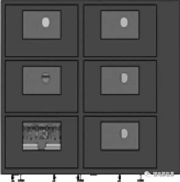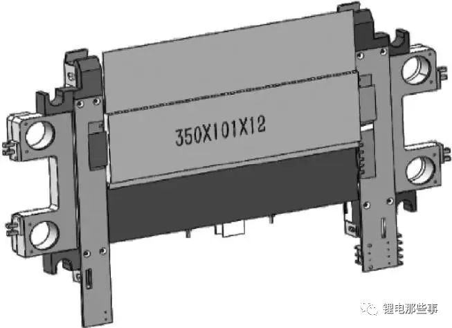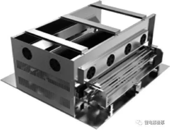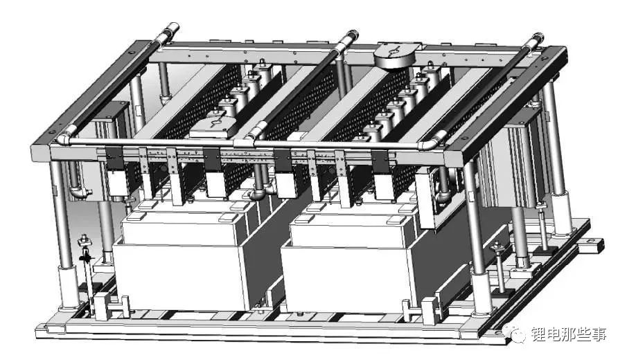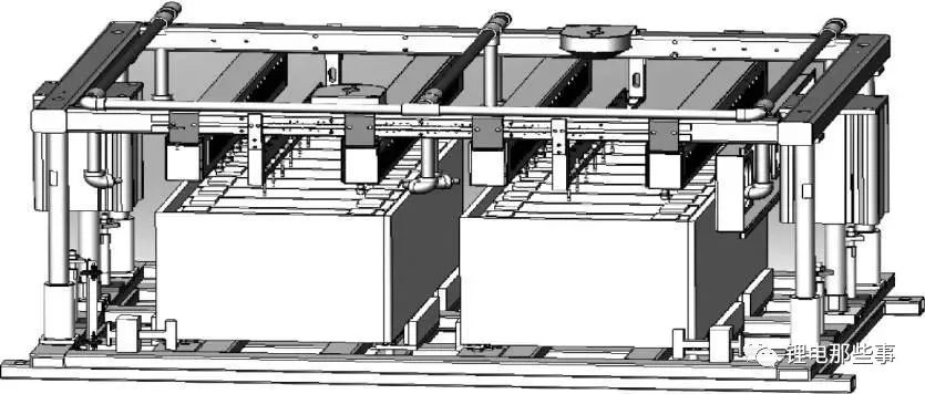 每个电池托盘组件包括铝板、加热板、温度传感器等。铝板在伺服电机的控制下实现对电池的加压;加热板可快速将电池加热到设定温度;温度传感器固定在铝板上,用来实时检测电池加热温度。图4为化成夹具示意图。
