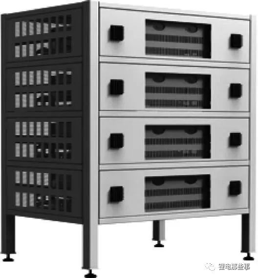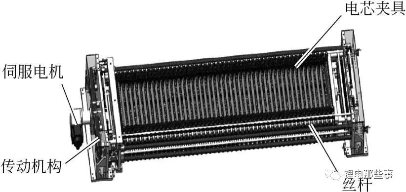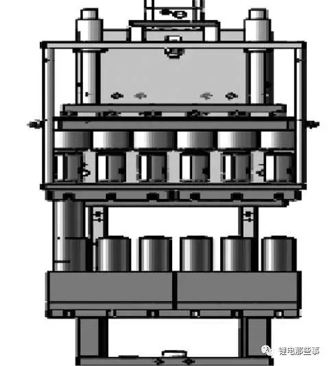 设备由两组高温加压机械单元构成,采用卧式结构,每个单元由32层托盘组件和伺服电机以及固定支架组成,每层可放置一个电池,每个单元放置32个电池。