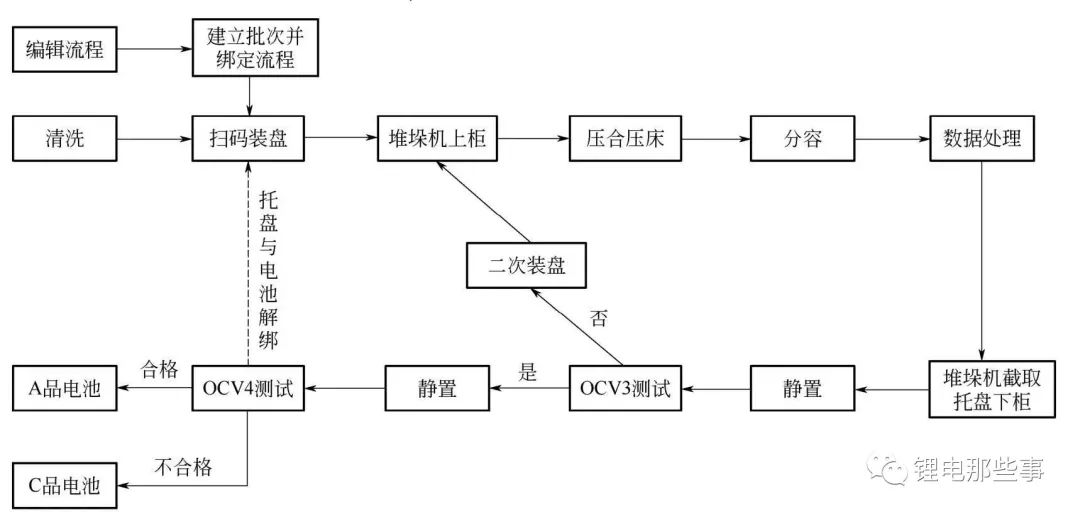 分容流程如图1所示。首先,清洗后的电池经过扫码装盘后由堆垛机转运上柜,分容柜压合压床进行分容,数据处理后弹开压床,堆垛机取出托盘下柜入库并静置一段时间,测量电池的OCV3,测出的OCV3若是不合格,需要二次装盘上柜,若是合格则需要静置一段时间测量电池的自放电后的OCV4,最后通过OCV4的测试结果完成对电池等级的筛选,若OCV4测试合格则判为A品电池,若是不合格则判为C品电池。