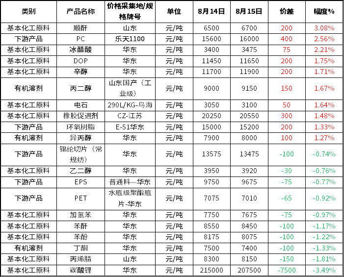 主要化工品涨跌排行榜前十位