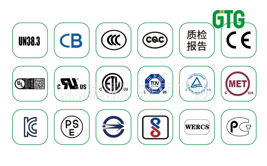 UN38.3认证,IEC报告,CB认证,中国CCC认证,中国CQC认证,中国台湾BSMI认证,美国加拿大UL认证, 美国加拿大ETL认证,美国加拿大TÜV认证,美国加拿大MET认证,美国WERCS注册,韩国KC认证,日本PSE认证, 欧盟CE认证, 英国UKCA认证, 印度BIS认证,俄罗斯GOST-R认证,泰国TISI认证,越南MIC认证,马来西亚SIRIM认证,巴西ANATEL认证,以色列SII认证,澳洲SAA/RCM认证……