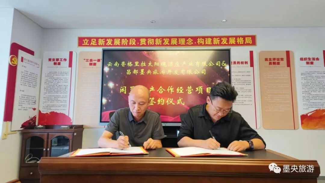 云南香格里拉太阳魂酒庄产业有限公司总经理李今滔、副董事长刘涛及墨央旅游副总周兆力、李建民等一并参加签约仪式。