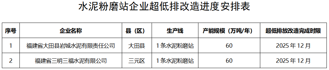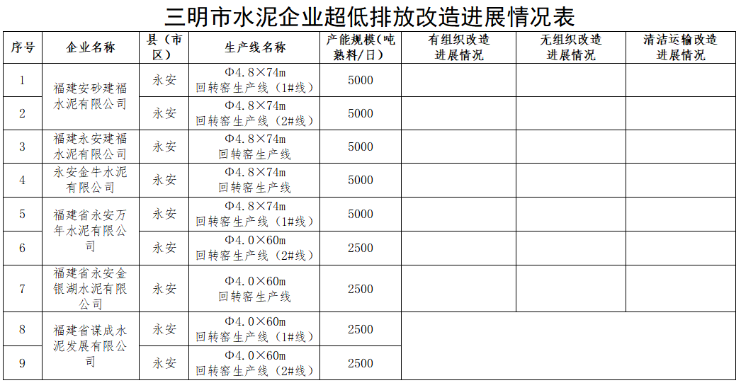 2024年底前,三明金牛、将乐金牛、永安建福、永安万年、新岩水泥4500吨/日及以上熟料生产线有组织排放基本完成改造;永安万年、金银湖水泥及福建金牛1#生产线2500吨/日熟料生产线有组织排放基本完成改造;同时全市4500吨/日及以上新型干法窑无组织排放基本完成改造;永安谋成水泥2条2500吨/日新型干法窑完成“上大压小”,改造为5000吨/日及以上,同步达到超低排放水平。