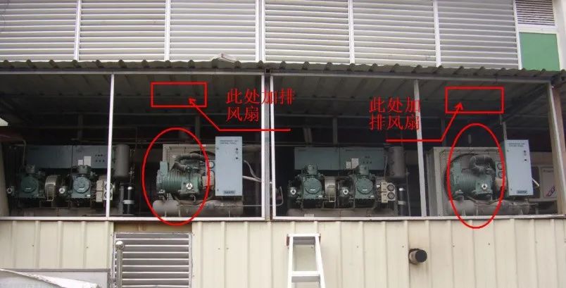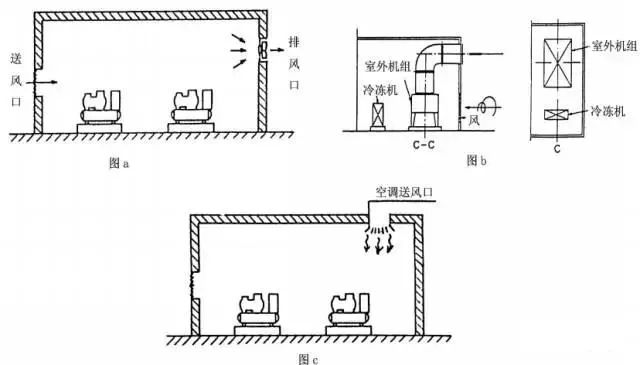 为防止冷冻机组排热气体滞留,机房需设置换气装置。换气扇直接面向门或窗;换气口面积是门(或窗)的内部尺寸有效面积;机械换气装置原则上作为排气装置,必须保证所需的排气容量。