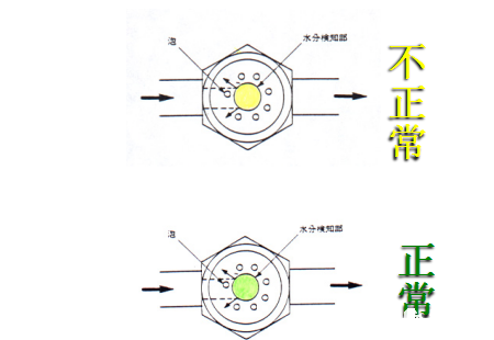 视液镜:从视液镜中观察冷媒的流量,冷媒合适时只有液体流动,而无白色气泡,系统内无水分时,视液镜中部视芯为绿色,否则为黄色或其他异常颜色。