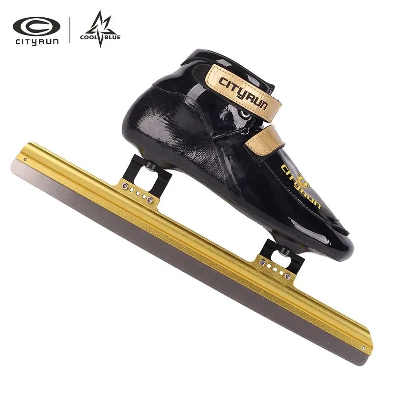 速滑冰鞋的鞋体部分主要由优质厚牛皮制成,并用玻璃纤维和碳钢加固。速滑冰鞋的冰刀又称为速滑刀,速滑刀由刀刃、刀身管、前小刀托,前大刀托、前托盘、后刀托和后托盘等部分组成。速滑冰鞋为半高腰瘦长形,鞋跟部为坚硬式,以便包围和固定脚跟。