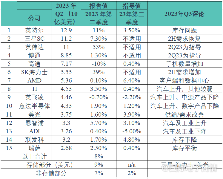 根据Semiconductor Intelligence的数据,在2023年第二季度,大多数主要半导体公司的收入较第一季度有所增长。