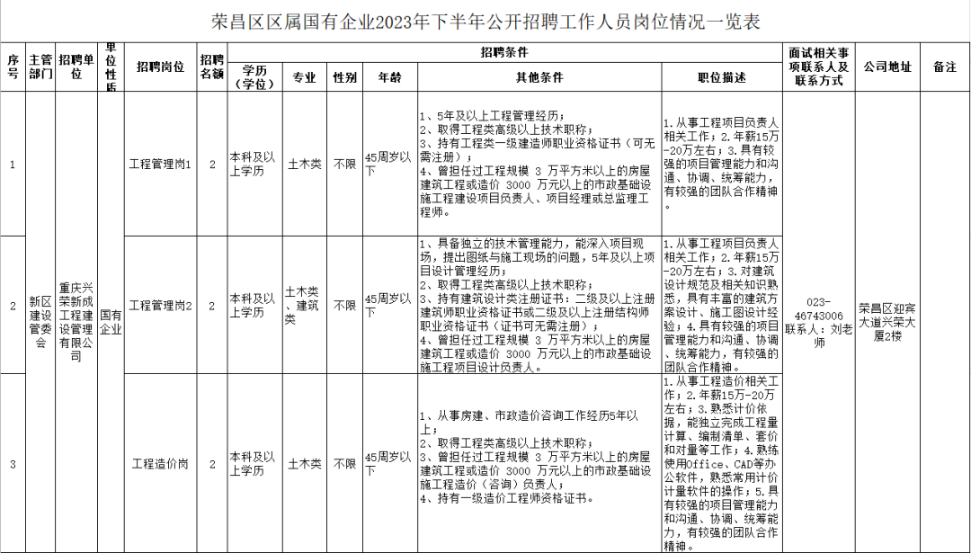 为加强公司人才队伍建设,按照《重庆市荣昌区国有资产监督管理委员会重庆市荣昌区人力资源和社会保障局关于印发<荣昌区区属国有企业招聘人员管理办法>的通知》(荣国资发〔2022〕20号)规定,为规范招录新进人员,经研究决定,现面向社会公开招聘工作人员。