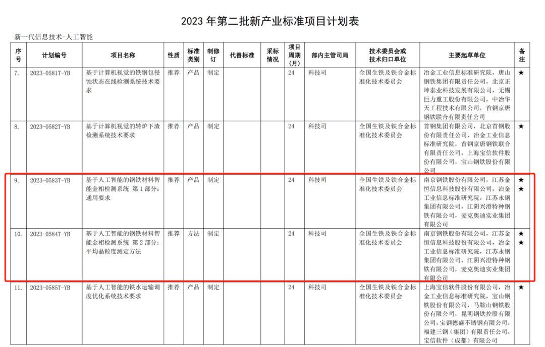 8月4日,工业和信息化部印发了“2023年第二批行业标准制修订和外文版项目计划”,由南钢及其子公司金恒科技等作为主要起草单位,新一代信息技术—人工智能领域的“基于人工智能的钢铁材料智能金相检测系统”两项行业标准的制定计划正式获批立项。