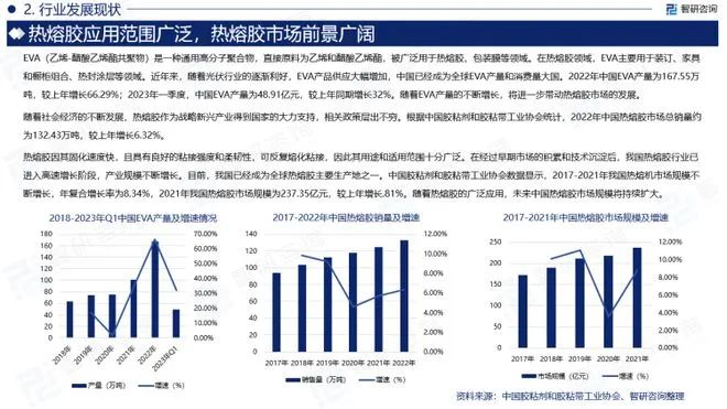 EVA(乙烯-醋酸乙烯酯共聚物)是一种通用高分子聚合物,直接原料为乙烯和醋酸乙烯酯,被广泛用于热熔胶、包装膜等领域。在热熔胶领域,EVA主要用于装订、家具和橱柜组合、热封涂层等领域。近年来,随着光伏行业的逐渐利好,EVA产品供应大幅增加,中国已经成为全球EVA产量和消费量大国。2022年中国EVA产量为167.55万吨,较上年增长66.29%;2023年一季度,中国EVA产量为48.91亿元,较上年同期增长32%。随着EVA产量的不断增长,将进一步带动热熔胶市场的发展。