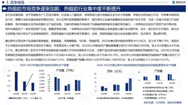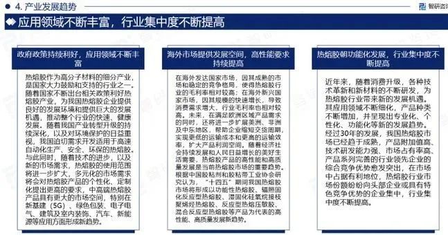 近年来,随着消费升级,各种技术革新和新材料的不断研发,为热熔胶行业带来新的发展机遇。其应用领域不断细化,产品种类不断增加,并呈现出专业化、个性化、功能化等新的发展趋势。经过30年的发展,我国热熔胶市场已经趋于成熟,产品附加值高、技术研发能力强、市场占有率高、产品系列完善的行业领先企业的综合竞争优势愈发突出,在市场中占据有利地位,热熔胶行业市场份额纷纷向头部企业或具有特色竞争优势的企业集中,行业集中度不断提高。