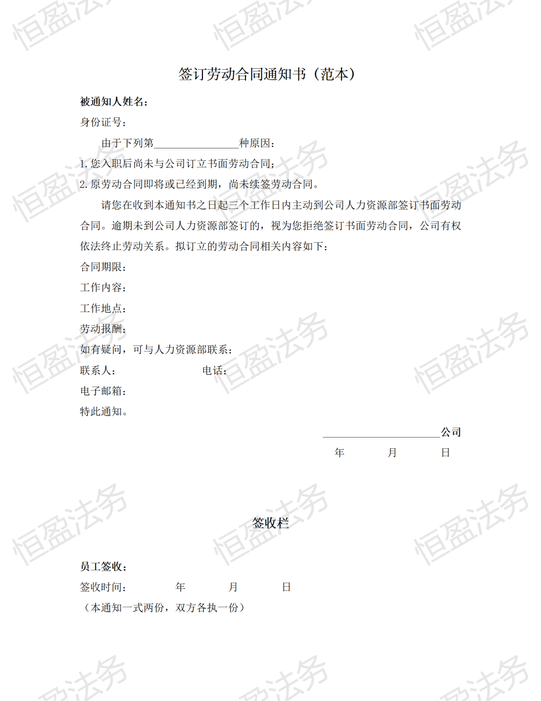 员工已入职但未签订书面劳动合同,或劳动合同约定期限即将届满等,用人单位须向劳动者发出签订或续签劳动合同的通知。