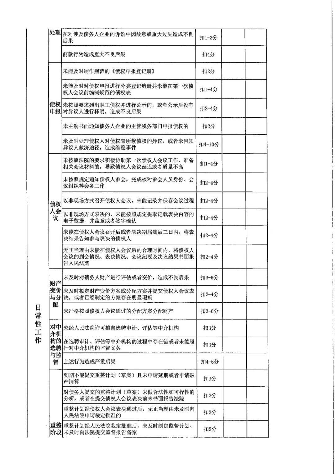(九)债权申报登记审查:管理人未能及时制作规范的《债权申报登记册》的,扣2分;未能及时对债权申报进行分类登记造册并未能在第一次债权人会议前编制规范的债权表的,视具体情况扣1~4分;未按照要求列出职工债权并进行公示的,或者公示后没有对异议人进行释明,造成不良后果的,视具体情形扣2~4分。
