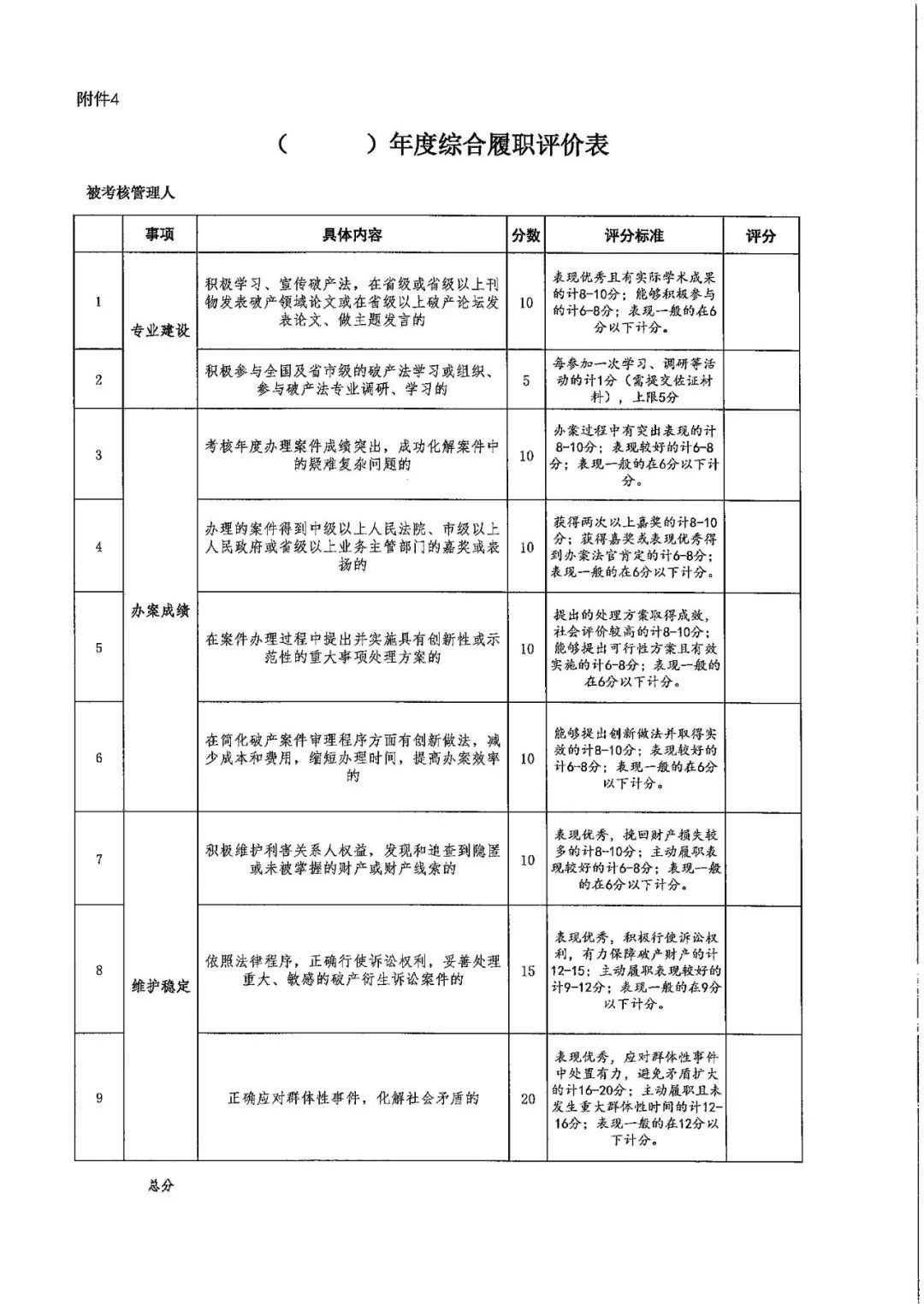 第十条 本院管理人考核小组根据管理人考核年度履职情况对管理人进行考核年度综合履职评价(附件4)。考核年度综合履职评价采取评分制考核标准,满分 100分。