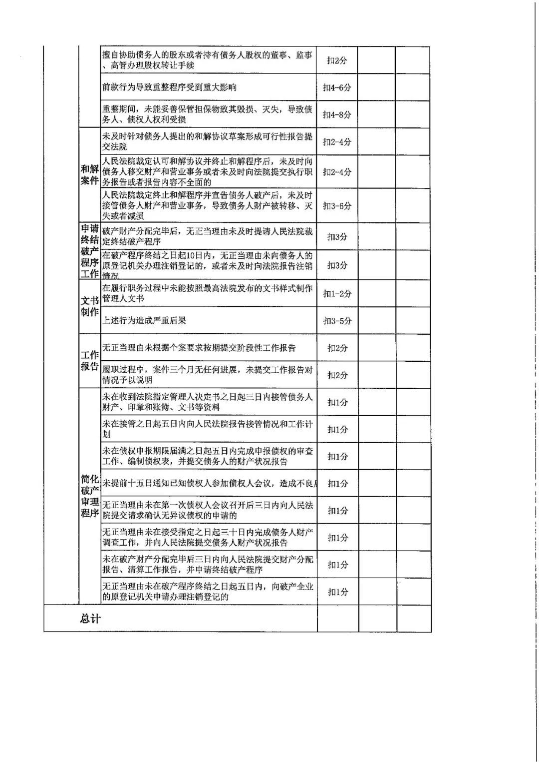 (十六)文书制作:管理人在履行职务过程中未能按照最高人民法院发布的文书样式制作管理人文书的,视具体情形扣 1~2分;造成严重后果的,视具体情形扣 3~5分。