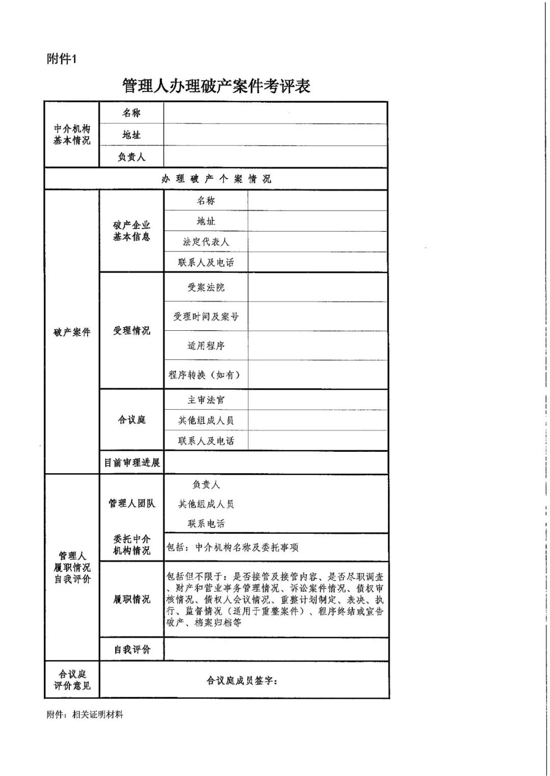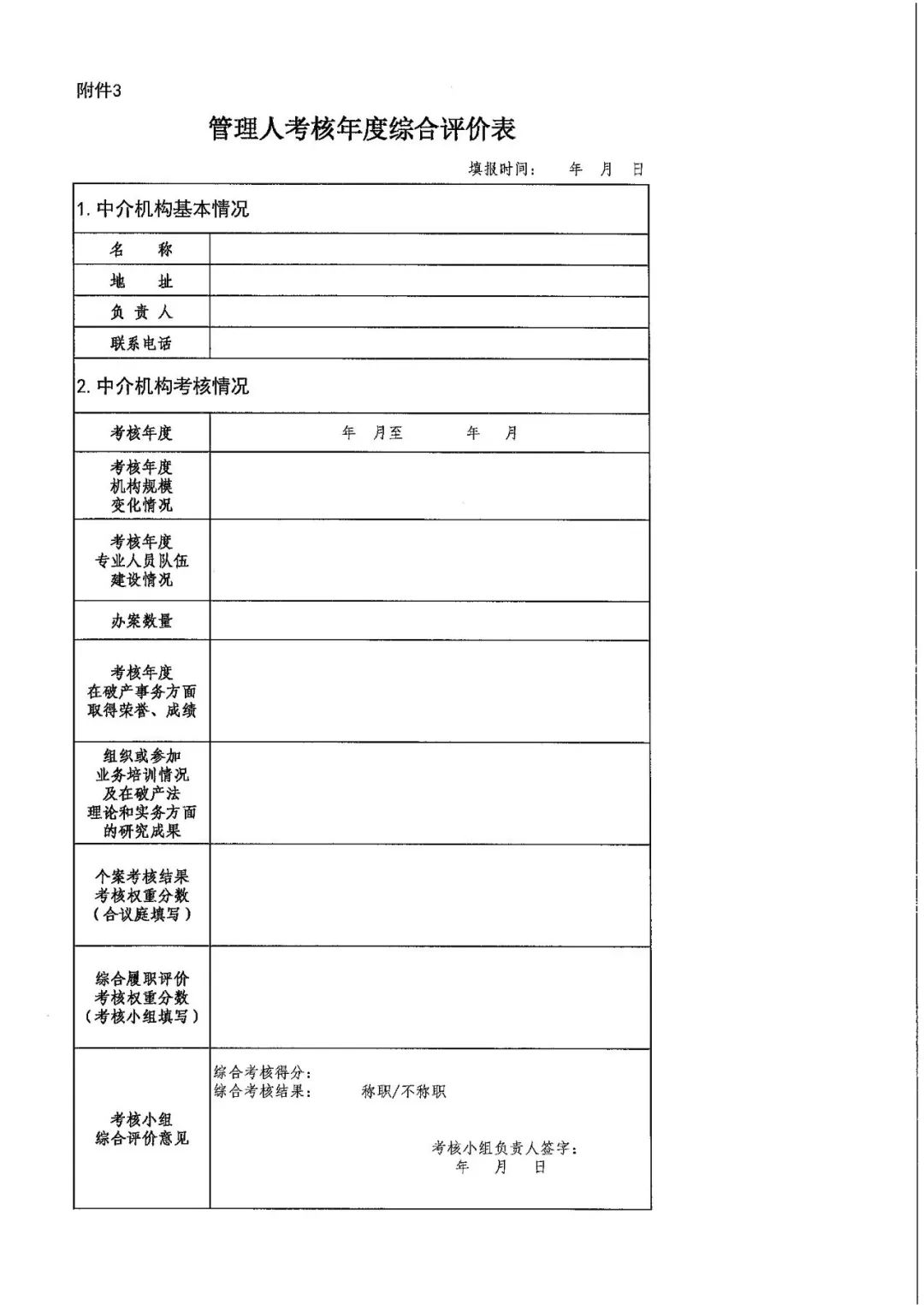 第九条 管理人应当于考核年度结束后次年1月15日前向审理该破产案件的合议庭提交《管理人办理破产案件考评表》(附件1)、《管理人考核年度综合评价表》( 附件 3)、年度履职报告及相关证明材料。合议庭填写《破产案件个案考评表》(附件2)后十个工作日内将管理人年度履职报告及附件1、附件2、附件3提交本院管理人考核小组。