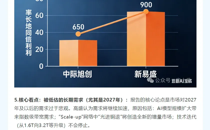 5.核心看点:被低估的长期需求(尤其是2027年):报告的核心论点是市场对2027年及以后的需求过于悲观。高盛认为需求将继续加速,原因包括:AI模型规模扩大带来指数级带宽需求;“Scale-up”网络中“光进铜退”将创造全新的增量市场;技术迭代(从1.6T向3.2T等升级)不会停止。