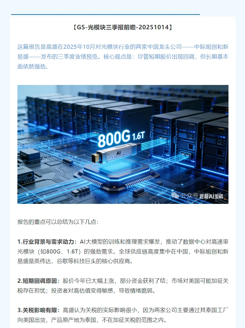 这篇报告是高盛在2025年10月对光模块行业的两家中国龙头公司——中际旭创和新易盛——发布的三季度业绩预览。核心观点是:尽管短期股价出现回调,但长期基本面依然强劲。