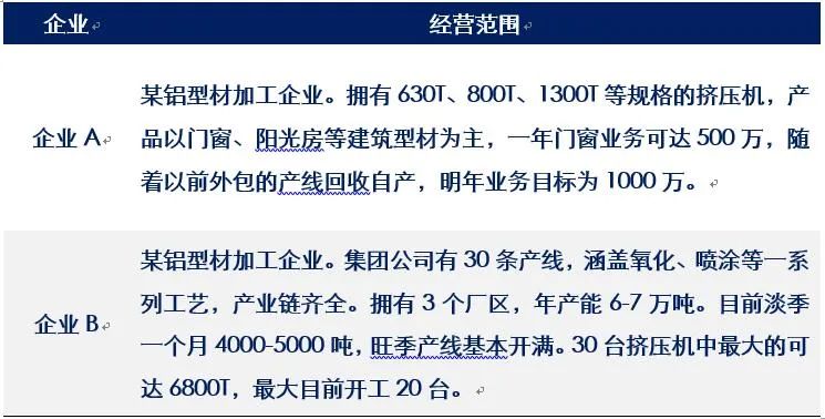 某铝型材加工企业。拥有630T、800T、1300T等规格的挤压机,产品以门窗、阳光房等建筑型材为主,一年门窗业务可达500万,随着以前外包的产线回收自产,明年业务目标为1000万。