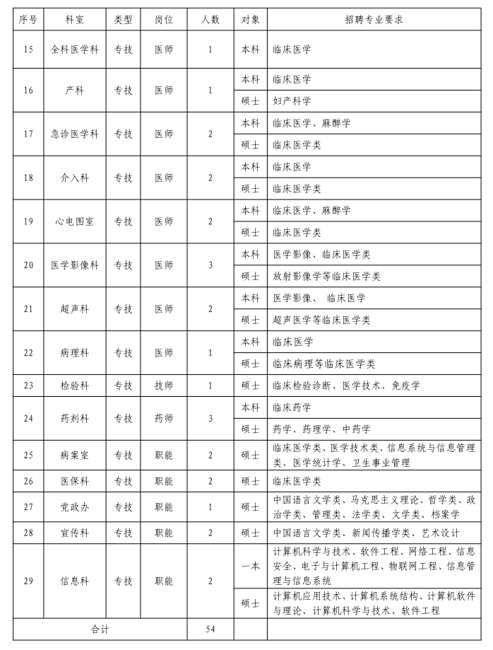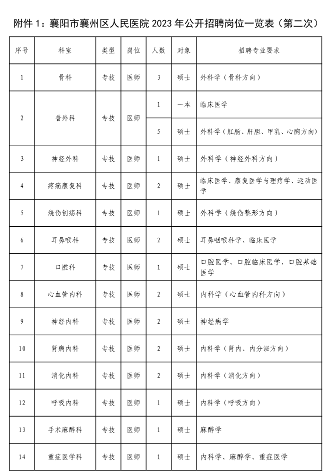 根据医院业务发展需要和2023年度医院招聘计划,襄州区人民医院发布《2023年度公开招聘专业技术人才公告》,招聘岗位77个。目前,部分岗位人员已经招聘到位,现将余下的54个岗位面向社会再次公开发布招聘公告。