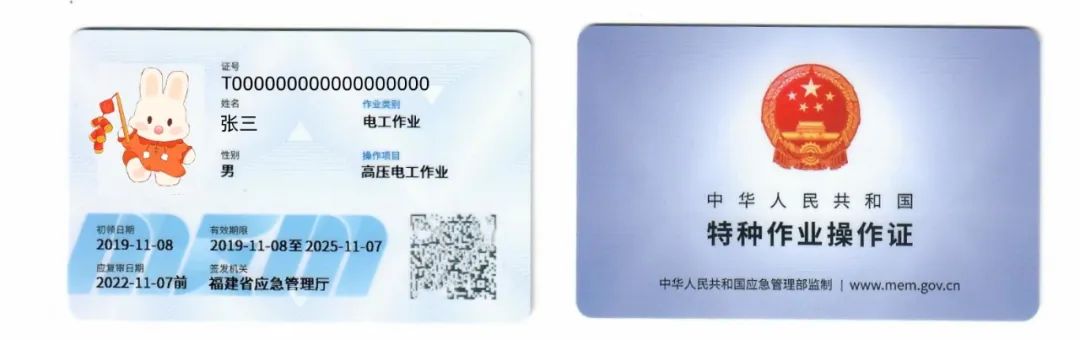 电工上岗证分为高压和低压等,作业电压一千伏以上用高压,作业电压一千伏以下用低压。证书3年一审,6年一换,由福建省应急管理厅签发。