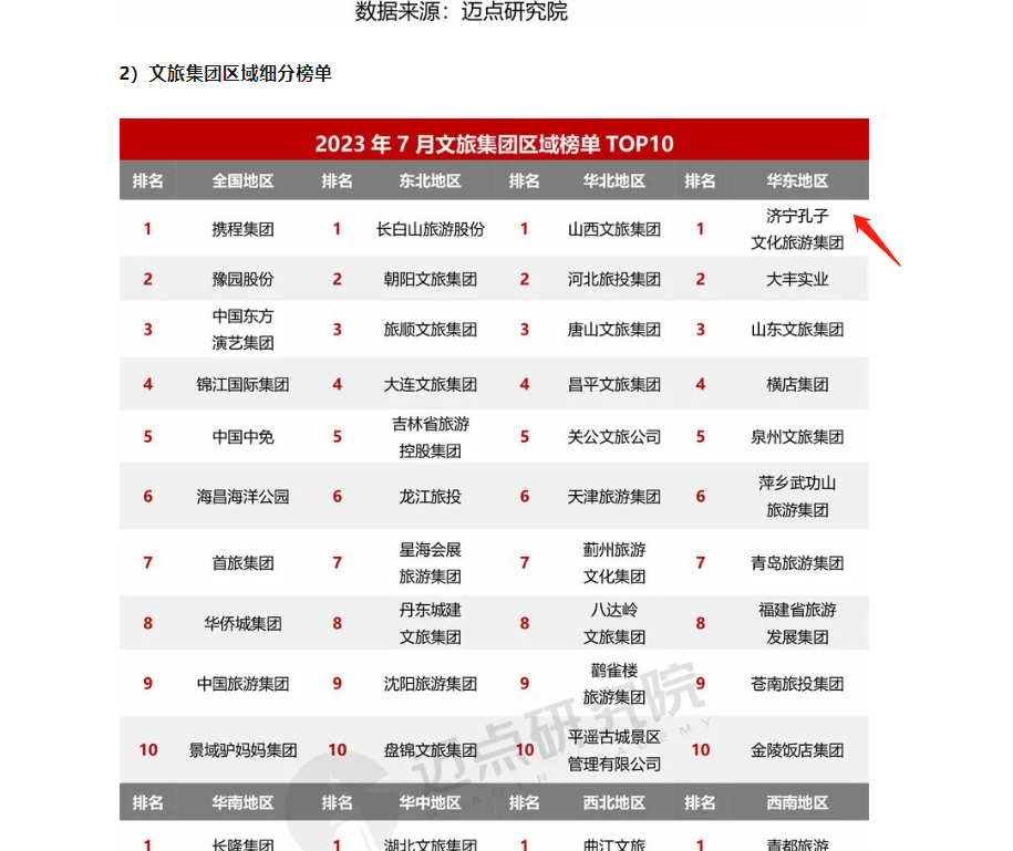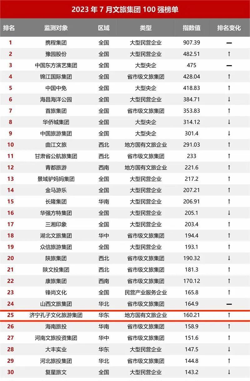 近日,权威机构迈点研究院最新“2023年文旅集团品牌影响力(MBI)年7月百强榜单”重磅发布。其中,省旅促会副会长单位孔子文旅集团以160.21的品牌指数再次荣登全国百强榜单,排名位列全国25名,华东地区第1名,省内第1名!