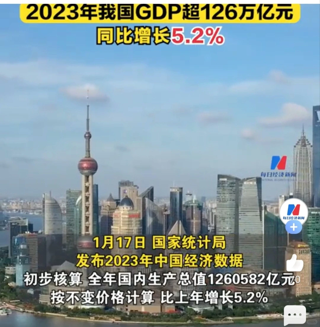 国家统计局于1月17日公布了2023年的经济数据:我国国内生产总值(GDP)突破126万亿元大关,达到惊人的1260582亿元。按照不变价格计算,这一数字比上年增长了5.2%。