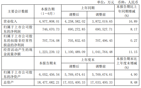 2023年上半年,公司实现营收497.78亿元,同比增长16.89%;归属于上市公司股东的净利润为74.67亿元,与上年同期的增长了8.17%;归属于上市公司股东的扣除非经常性损益的净利润为70.77亿元,同比增长0.27%。