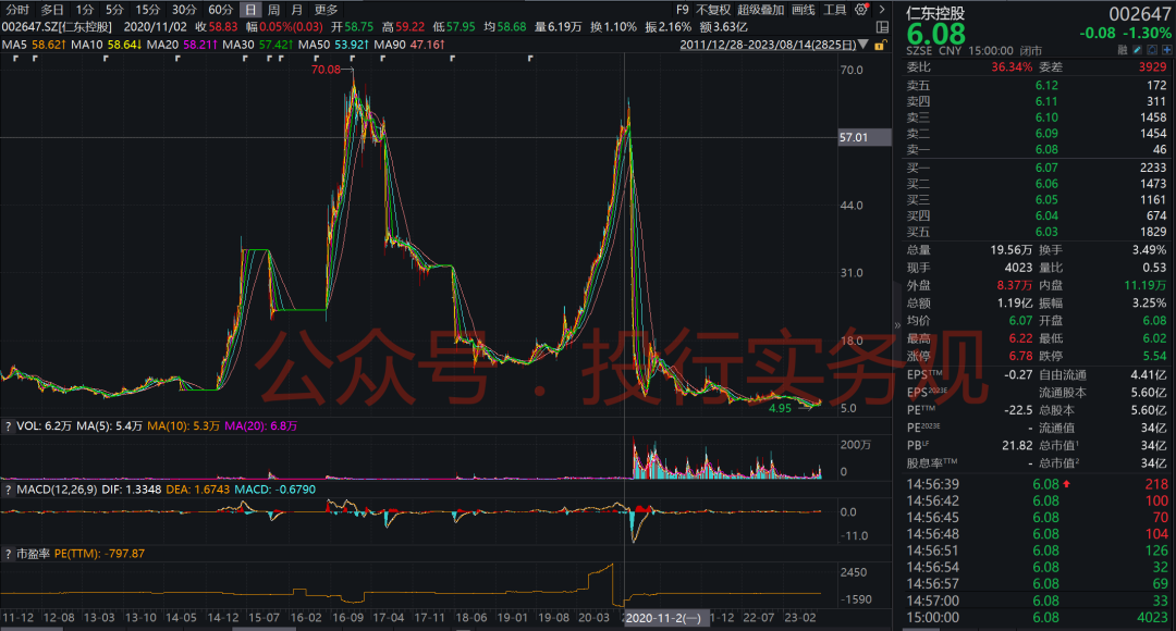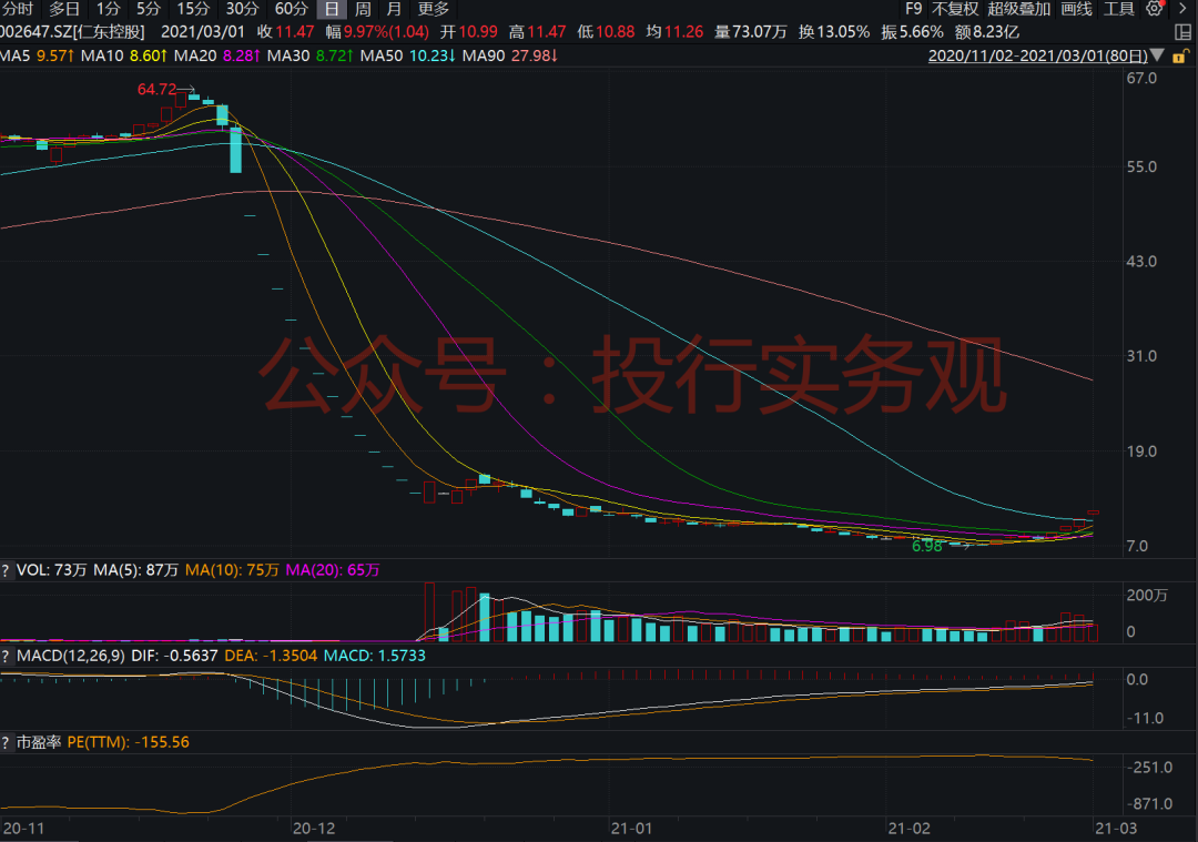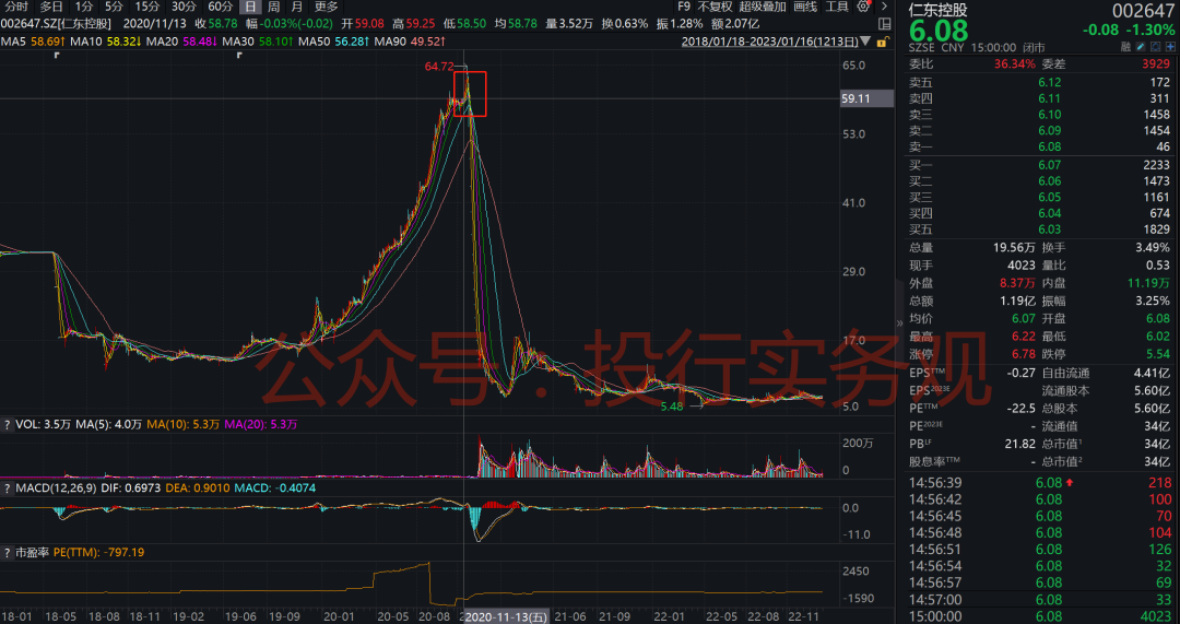 2018年8月以来便是我们目前知道的仁东控股了,公司实控人为霍东。从公司股价走势也可以看出,2018年以来公司股价走势明显分成两个阶段,在2020年11月之前,仁东控股股票走出了一个波澜壮阔的行情,2020年年内涨幅近300%,然而2020年11月之后,公司股价直接迎来了著名的14个跌停,广大投资者走都走不了,直接被深度套牢: