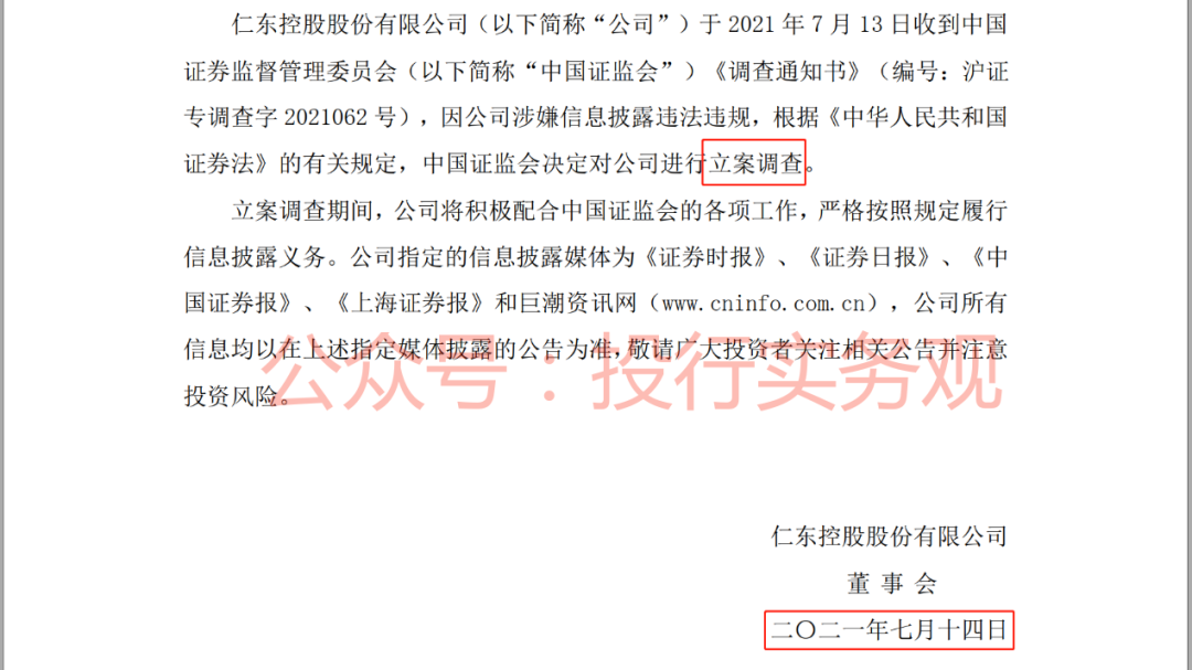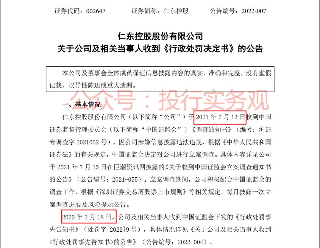 仁东控股是2021年7月13日收到的证监会《立案调查通知书》的,经过半年多调查,2022年2月18日证监会正式下发了《行政处罚决定书》,监管机构的调查进度不可谓不快。