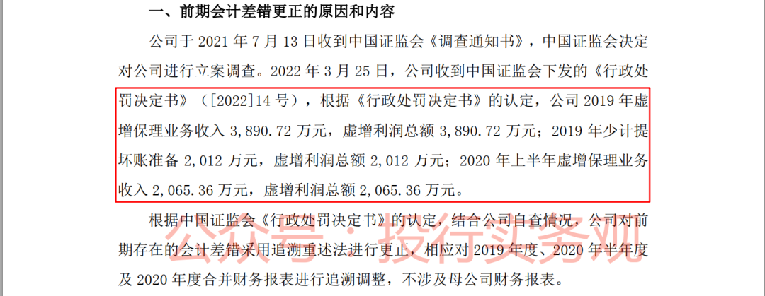 如上所示,由于在2022年2月收到证监会行政处罚决定后,公司于2022年4月30日发布了《关于前期差错更正的公告》,对公司2019年和2020年财务报告数据进行调整: