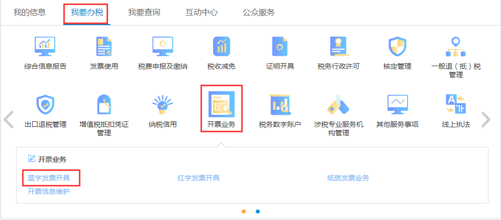 登录电子税务局,【我要办税】-【开票业务】,点击【红字发票开具】进入开具。如下图所示: