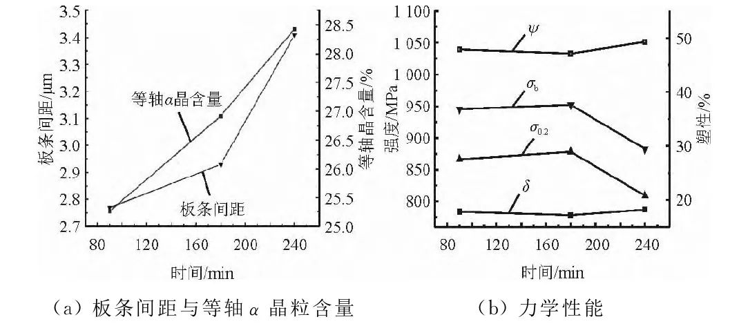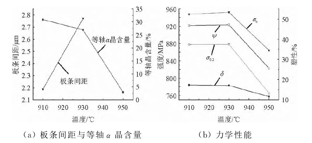 (2)当热等静压工艺为930℃×130 MPa×3h时,TA15合金为典型的网篮组织,板条间距与等轴α晶粒含量较低,TA15合金获得的压坯室温力学性能可达同质锻件水平,其抗拉强度平均值可达952.3MPa, 伸长率均值可达17.1%,屈服强度为866.3MPa, 断面收缩率为47.9%。