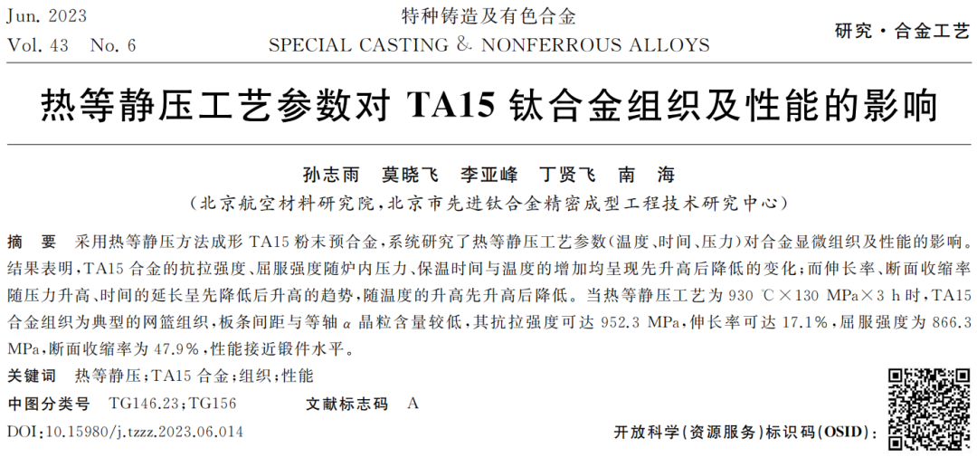 孙志雨,莫晓飞,李亚峰,等.热等静压工艺参数对TA15钛合金组织及性能的影响[J].特种铸造及有色合金,2023,43(6):804-807.