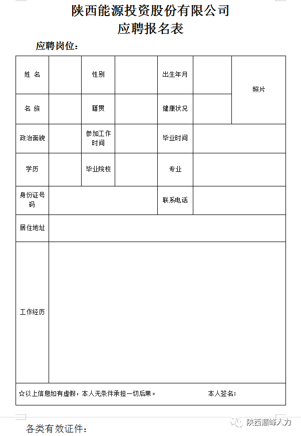 1.本次招聘采取网上报名的方式,不设现场报名。每名应聘者仅限报名一个岗位。报名需下载并填写《陕西能源投资股份有限公司应聘报名表》(附件),按表填写相应信息,如实提供电子版学历证书、学位证书、《教育部学历证书电子注册备案表》、职称证书、身份证扫描件(正反面放一页)、执行资格证书及技能等级证书(若有)。