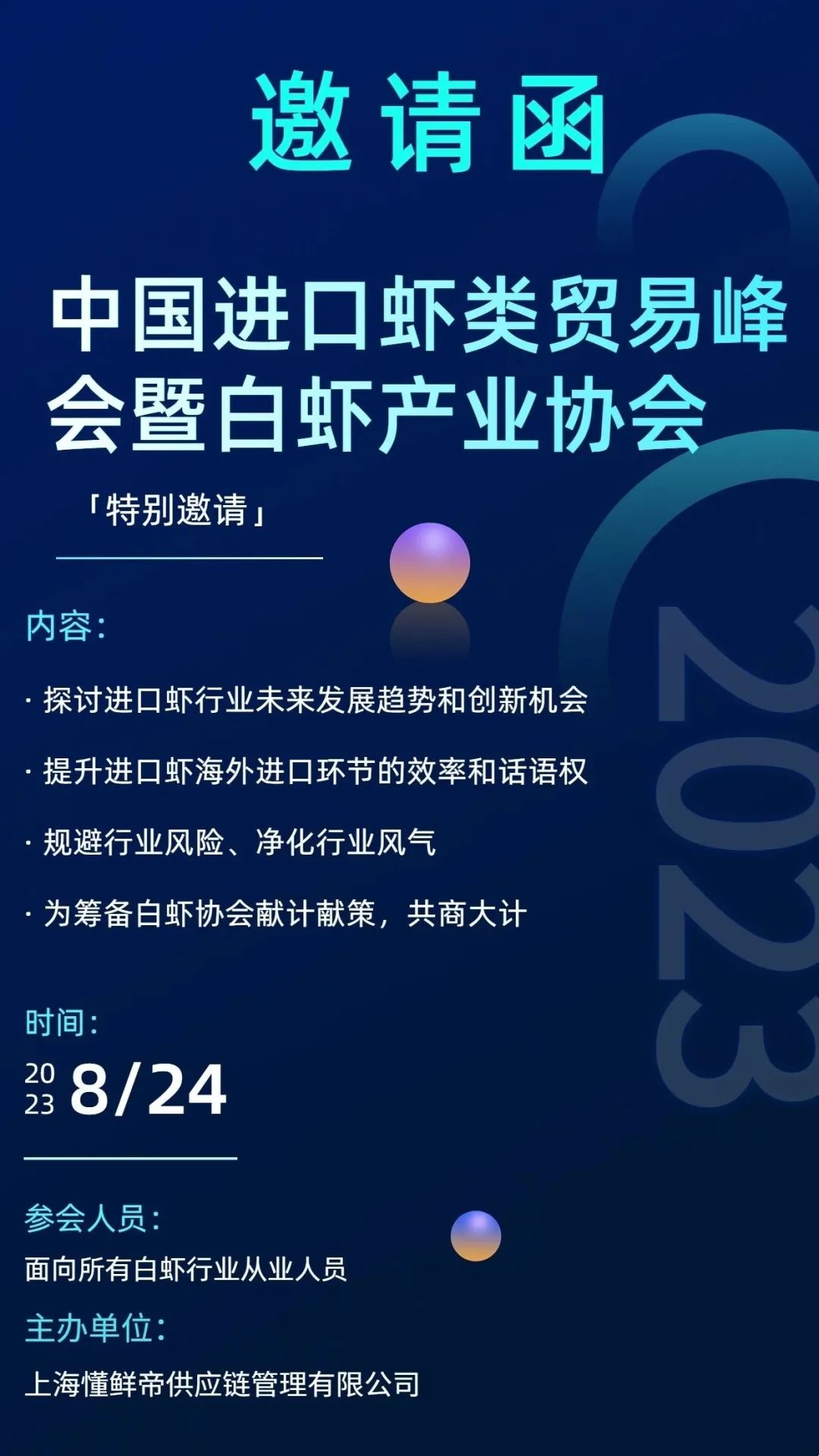 我们期待与各位分享,也倾听来自各方的声音,共同探索白虾市场的潜力,促进行业的可持续增长和创新发展。8月24日,在上海国际渔业博览会期间,中国进口虾类贸易峰会暨白虾产业协会筹办会议,我们上海见!