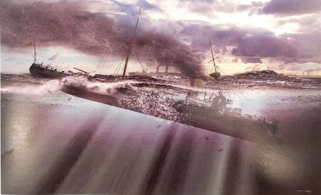 在激战中,北洋舰队的“定远”舰忽然船身中炮,继而引发大火,此时的日本舰船乘机向“定远”舰扑来,企图将其击沉。危急时刻,“致远”舰管带邓世昌果断下令,用舰艏的撞角直冲日本舰队主力舰“吉野”号,准备将其撞沉,以挫其气焰。遗憾的是,“致远”舰在快靠近敌舰时中弹爆炸,全舰沉没,全舰官兵250余人一同壮烈殉国。