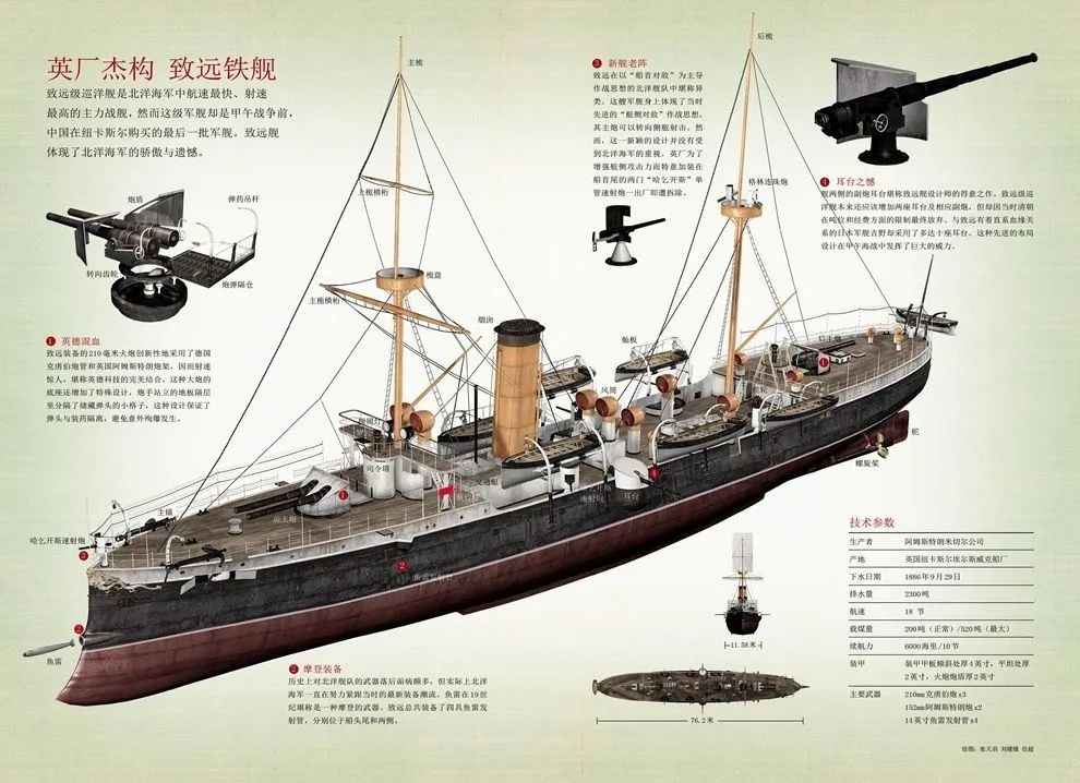 李鸿章著名幕僚薛福成在日记中明确记述了“英厂杰构”(杰构乃佳作之意)的穹甲巡洋舰的详细数据——战舰排水量为2300吨,首尾两颗立柱之间的距离为250英尺,全场267英尺。战舰最宽处38英尺,吃水深度在14-21英尺之间,甲板高度6.3英尺。因为使用了首尾楼船型所以首尾楼离海平面的距离为19英尺。