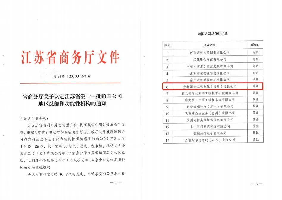 2020年,查特深冷工程系统(常州)有限公司获评江苏省第十一批跨国公司功能性机构。