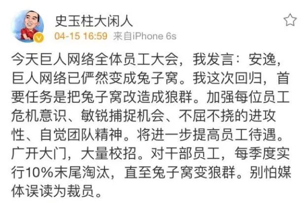 为了扭转局面,史玉柱亲自出马,向马爸爸取经,并决定引入狼性文化,惩治团队里的兔子。