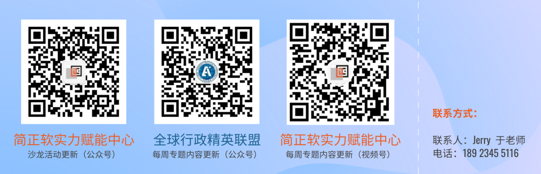 欢迎大家持续关注我们的动态,我们的公众号《全球行政精英联盟》和视频号《简正软实力赋能中心》每周都会保持更新,为您提供最新、最优质的内容。