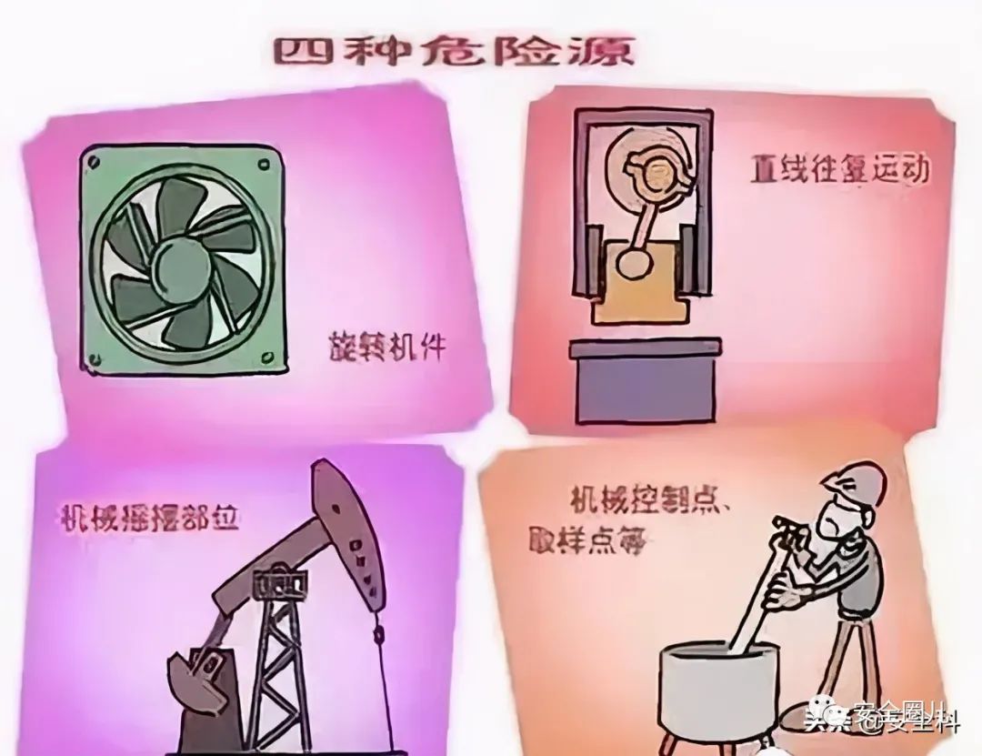 ➤旋转的机件具有将人体或物体从外部卷入的危险;机床的卡盘、钻头、铣刀等、传动部件和旋转轴的突出部分有钩挂衣袖、裤腿、长发等而将人卷入的危险;风翅、叶轮有绞碾的危险;旋转的滚筒有使人被卷入的危险。