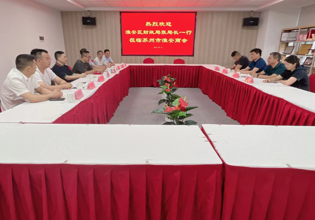 2023年8月15日,淮安区财政局张银发局长一行四人莅临苏州市淮安商会走访座谈。苏州市淮安商会会长吴晓涛,常务副会长沈青龙,副会长花正茂、房修楼、孙寿轩、刘俊、张福军,理事顾春友和会员企业家钱凯热情接待了张局长一行。