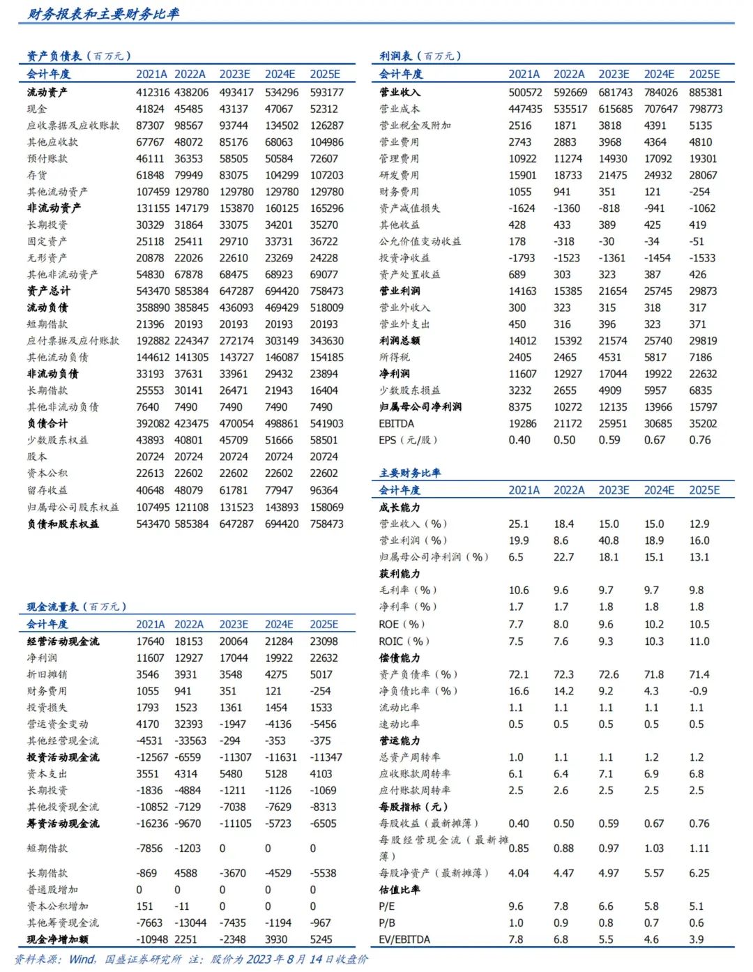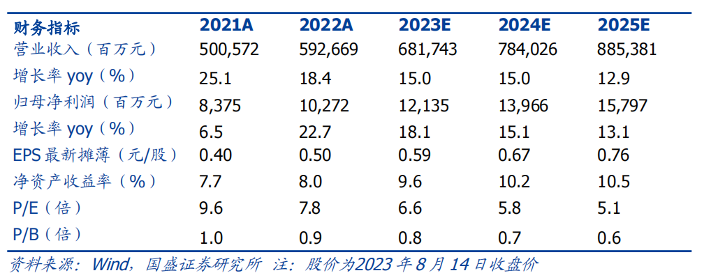 投资建议:我们预计公司2023-2025年归母净利润分别为 121/140/158 亿元,同比增长 18.1%/15.1%/13.1%,EPS分别为 0.59 /0.67 /0.76 元,当前股价对应PE分别为 6.6 /5.8 /5.1倍。可比公司2023年平均PE为8.7倍,考虑到公司未来良好的成长性以及相对可比公司较低的估值,首次覆盖给予“买入”评级。