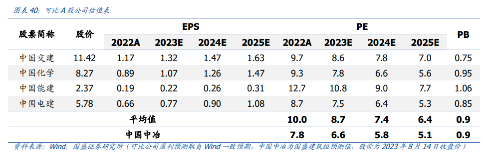我们预计公司2023-2025年归母净利润分别为121/140/158亿元,同比增长18.1%/15.1%/13.1%,EPS分别为0.59/0.67/0.76元,2023/8/14股价对应PE分别为6.6/5.8/5.1倍。我们选取中国化学、中国能建、中国交建、中国电建四家专业工程央企作为可比公司,当前同业可比公司2023年平均PE为8.7倍,考虑到公司未来良好的成长性以及相对可比公司较低的估值,首次覆盖给予“买入”评级。